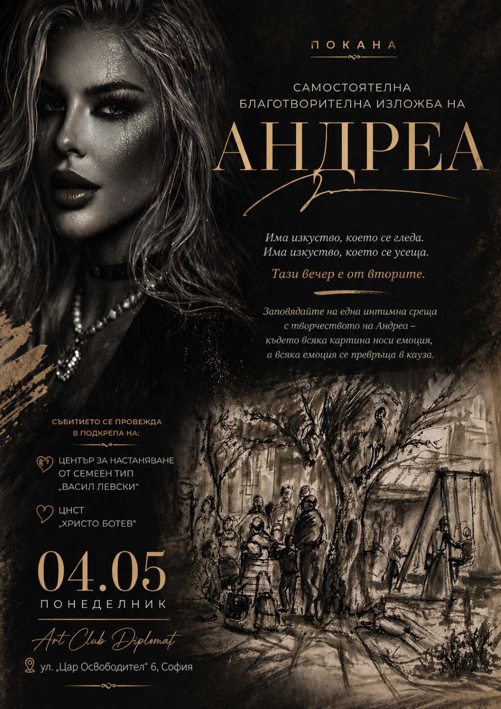 Популярната българска изпълнителка и артист Андреа ще представи своята самостоятелна изложба в елегантната атмосфера на Art Club Diplomat на 4 май, когато ще се състои официалното откриване на събитието.