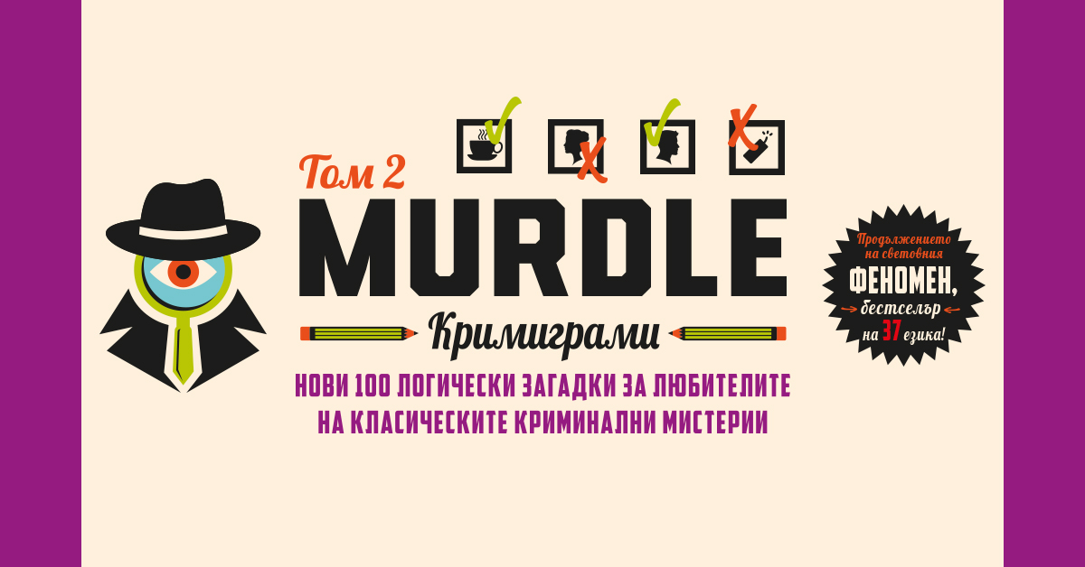 От доста време читателите у нас очакват продължението на „MURDLЕ: КРИМИГРАМИ“ – световен бестселър, който е истинско приключение за всеки любител на класическите криминалета и логическите загадки. Първият том освен, че е носител на наградата „Книга на годината“ и има над 1 200 000 тираж, се превърна в истински хит сред българските читатели. И у нас книгата повтори успеха си както в чужбина, а въпросите за продължението не стихваха.