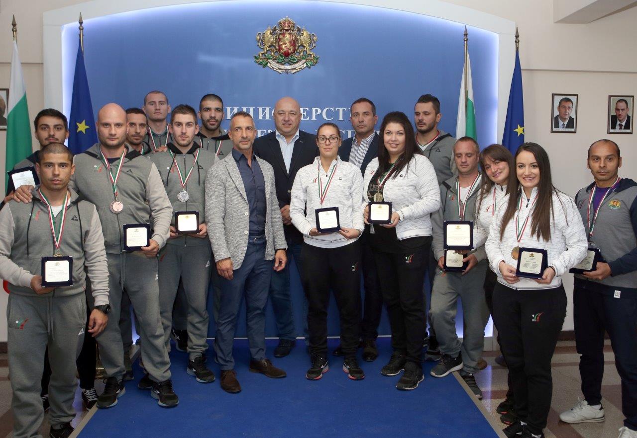 Министърът на младежта и спорта Красен Кралев връчи почетни плакети на българските състезатели от националния отбор и треньора им Димитър Тодоранов, които спечелиха медали от 25-ото Световно първенство по шотокан карате-до в Унгария. Министърът се ръкува с всеки един от призьорите и ги поздрави за силното представяне.