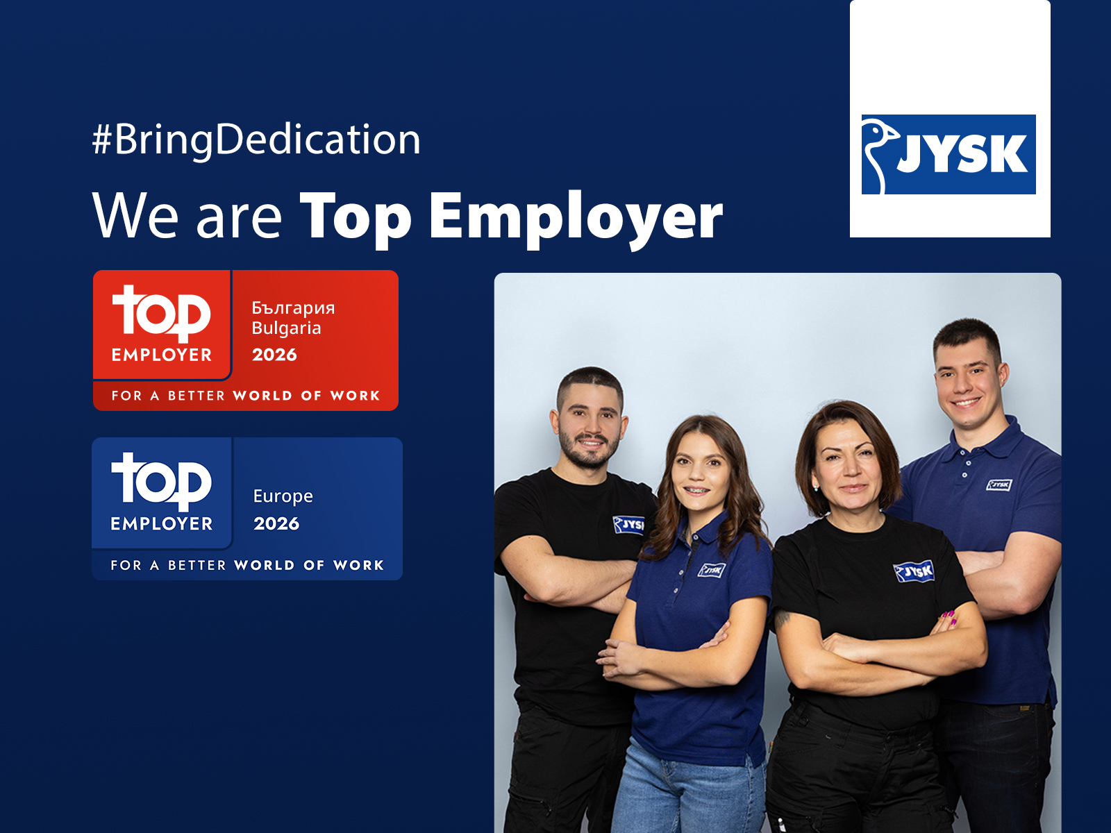 Скандинавският търговец на дребно за продукти за дома и съня JYSK бе признат за ТОП работодател в България за 2026 г. от Института Top Employers.