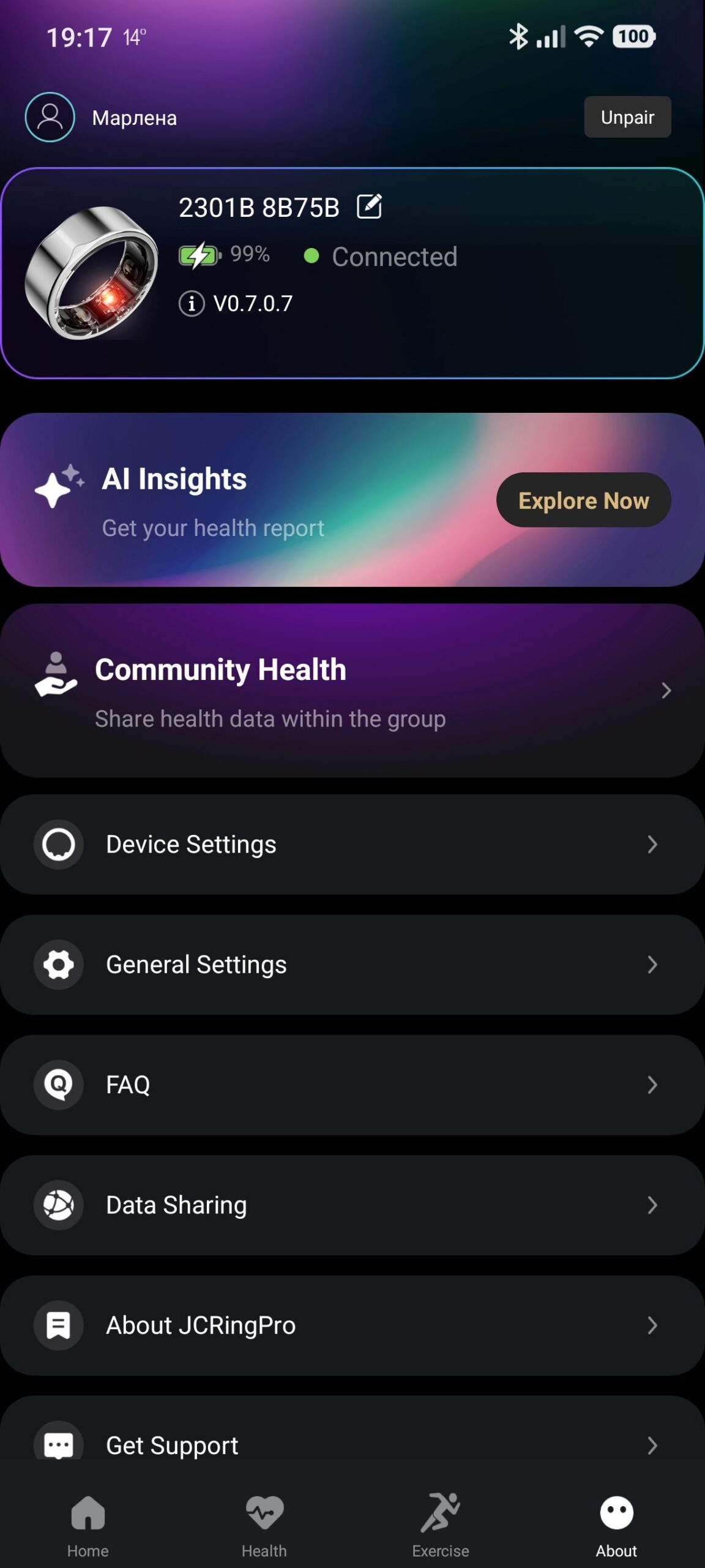 Xmart е съвместим с Android (след V5.0) и iOS (след V10.0) и поддържа Bluetooth 5.0. Батерията Li-Po издържа около седем дни денонощно носене при оптимални настройки, което е отлична автономност за устройство с толкова много функции. Зареждането се осъществява за около два часа в компактния кейс с USB Type-C конектор и е изключително лесно – пръстенът просто се поставя на мястото му и той започва да се зарежда.